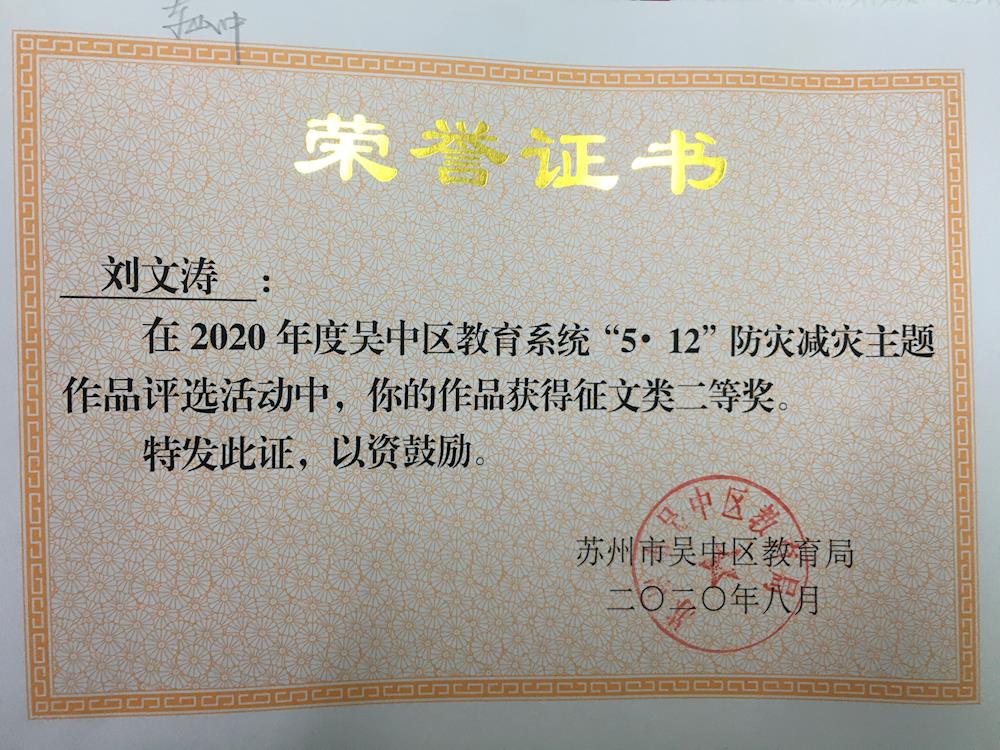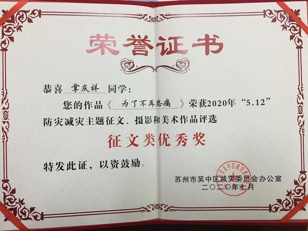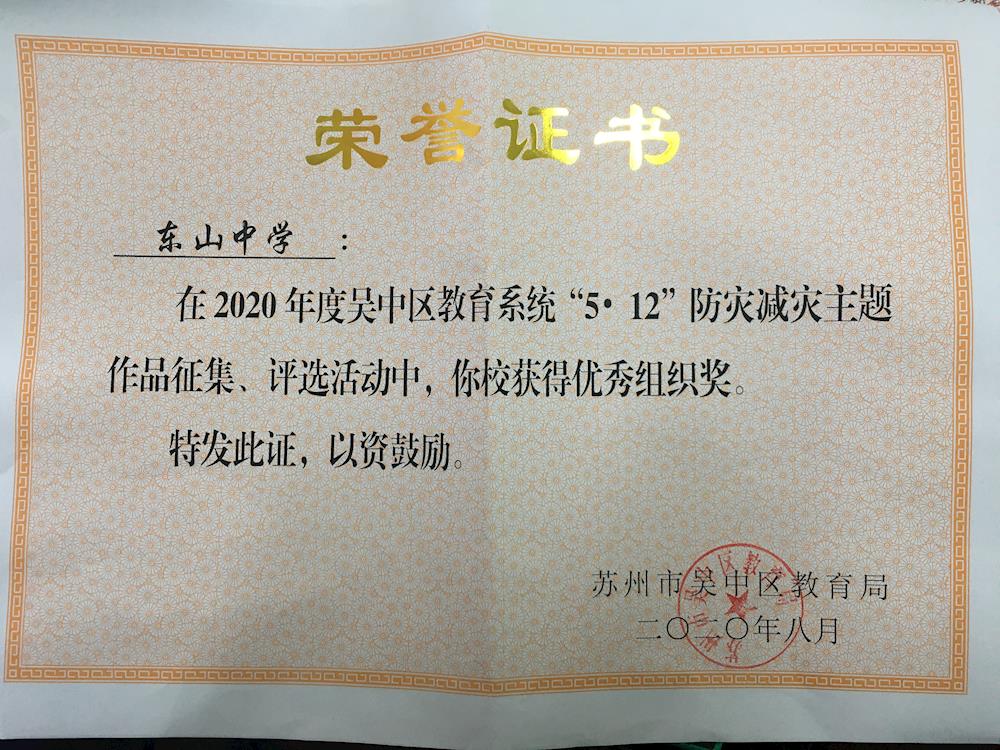 吴中区防灾减灾征文活动获奖简讯 来源: 发布时间:2020-12-15 15:17:30 浏览次数: 次 【字体:小 大】 在2020年吴中区防灾减灾征文活动中,我校掌庆祥等同学分别获得一、二等奖,东山中学被评为优秀组织奖。 东山中学德育处 2020.12 分享到: 【打印正文】