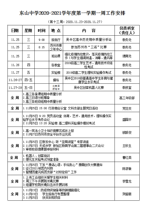 东山中学2020-2021学年度第一学期第十三周工作安排